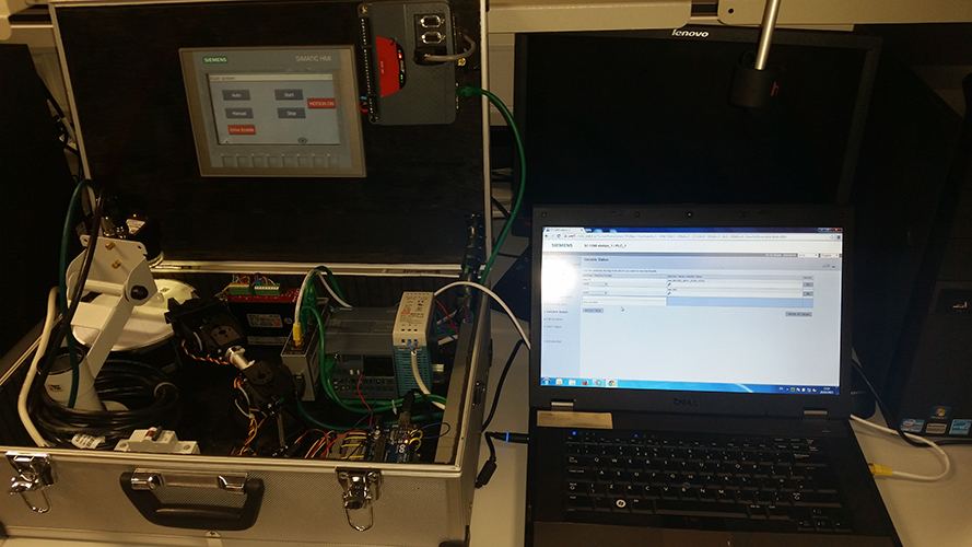 - A Siemens PLC to control the robots movements, communicate with the camera to get the objects position, control the conveyor belt and interface with the HMI.